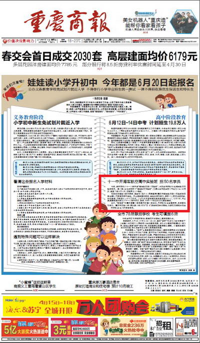 此外,“珍珠班”由重庆兼善中学和梁平红旗中学承办,各招收50 名家境贫困、品学兼优的学生。重庆市实验中学(原巴县中学)作为“空飞”预备学员培训基地,仍按有关规定面向全市招收40 名飞行预备学员。