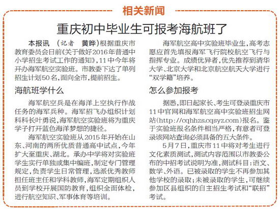 本报讯(记者黄晔)根据重庆市教育委员会日前《关于做好2016年普通中小学招生考试工作的通知》,11 中今年将开办海军航空实验班。市教委下达了单列招生计划50名,面向全市,提前招生。
