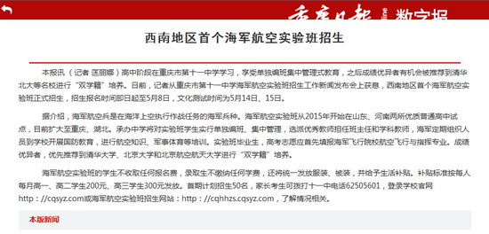 本报讯 (记者 匡丽娜)高中阶段在重庆市第十一中学学习,享受单独编班集中管理式教育,之后成绩优异者有机会被推荐到清华北大等名校进行“双学籍”培养。日前,记者从重庆市第十一中学海军航空实验班招生工作新闻发布会上获息,西南地区首个海军航空实验班正式招生,招生报名时间即日起至5月8日,文化测试时间为5月14日、15日。
