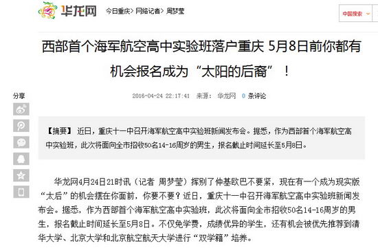 华龙网4月24日21时讯(记者周梦莹)挥别了仲基欧巴不要紧,现在有一个成为现实版“太后”的机会摆在你面前,你要不要?近日,重庆十一中召开海军航空高中实验班新闻发布会。据悉,作为西部首个海军航空高中实验班,此次将面向全市招收50名14-16周岁的男生,报名截止时间延长至5月8日。不仅免学费,成绩优异的学生,还有机会被优先推荐到清华大学、北京大学和北京航空航天大学进行“双学籍”培养。