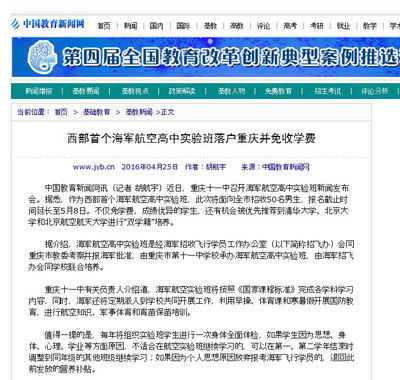 [中国教育新闻网] 西部首个海军航空高中实验班落户重庆并免收学费