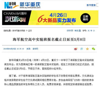 [新华网] 海军航空高中实验班报名截止日延至5月8日