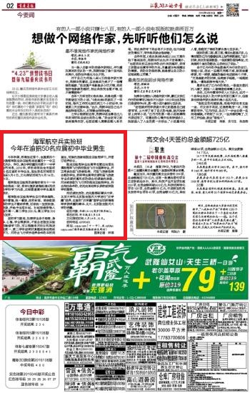 今年秋季,西南地区首个、全国第四个中国海军航空兵实验班将在重庆十一中正式开办。昨日,承办学校重庆市第十一中学发布消息,2016年,学校将面向全市招收50名应届初中毕业生,招生报名时间即日起至5月8日,文化测试时间为5月14日、15日。