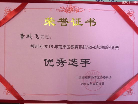 本次考试内容涉及《党章》、《中国共产党廉洁自律准则》、《中国共产党纪律处分条例》等党内政策法规。时间紧,学习任务重,三位老师工作之余加紧学习,在比赛中取得了优异成绩,我校组队代表第二片区参赛,荣获片区组织奖,其中童鹏飞老师荣获区“优秀选手”称号。
