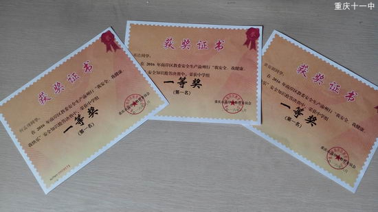 为进一步推进2016年南岸区“安全生产月”和安全生产“渝州行”活动的开展,6月,区教委举行安全知识抢答赛决赛,我校何孟瑾、邓浩、黄姿颖三学子分获一等奖第一名。