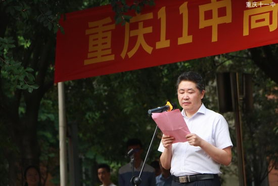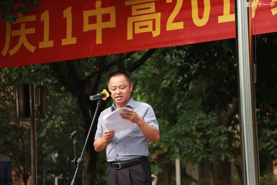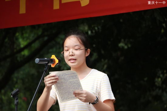刘志荣老师作为教师代表作了题为《行走在路上》的发言。在发言中,刘老师结合自身的教学经历向高三学生说明了重庆十一中CBD校区是块神奇的土地,在这里走出了两位状元,在这里无数十一中学子实现了自己的梦想,在这里高三全体老师,一定会和同学们并肩战斗,做大家冲刺路上的加油站,做大家高考信息的查询台,做大家心理的咨询师,为同学们保驾护航,摇旗呐喊,与同学们同甘共苦,风雨同舟!在刘老师发言之后,高2017级9班寻斯琪同学作了题为《其实,你无比强大》的国旗下讲话。寻斯琪同学通过美国麻省艾摩斯特学院曾经做过的南瓜耐压实验这一案例告诉全体同学,我们每个人都无比强大,只要我们有强烈的愿望,只要我们真正努力,我们每个人都会取得最后的胜利。