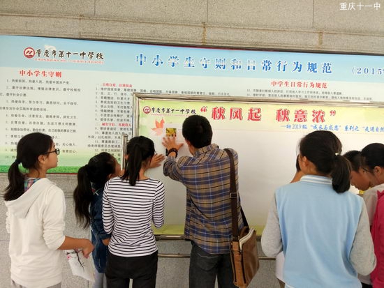 雷老师带着初一(1)班学生一起布置展板