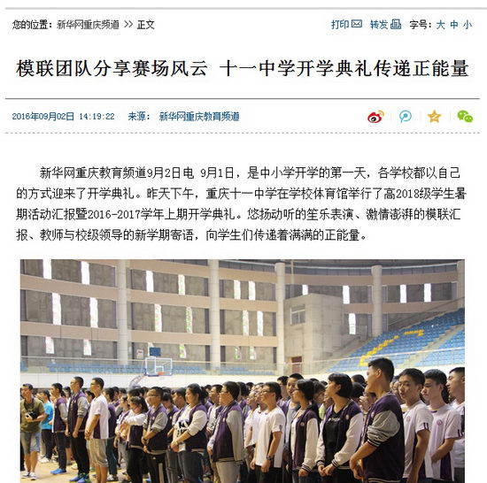 新华网重庆教育频道9月2日电 9月1日,是中小学开学的第一天,各学校都以自己的方式迎来了开学典礼。昨天下午,重庆十一中学在学校体育馆举行了高2018级学生暑期活动汇报暨2016-2017学年上期开学典礼。悠扬动听的笙乐表演、激情澎湃的模联汇报、教师与校级领导的新学期寄语,向学生们传递着满满的正能量。