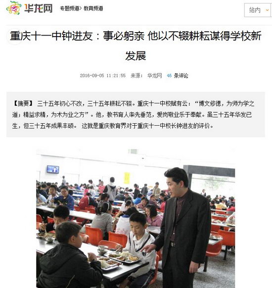 这就是重庆教育界对于重庆十一中校长钟进友的评价。在重庆十一中担任校长期间,钟进友坚持担任“重庆市中小学骨干教师培训班”、“重庆市高中校长提高班”的培训讲座工作,受到教师、校长的高度评价,从教35年来,为国家培养了大批的优秀学生、骨干教师和骨干校长,受到社会各界高度赞扬。