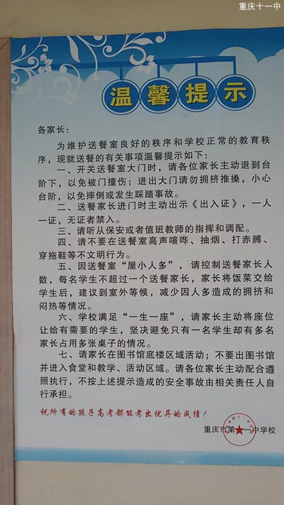 对于家长来说,送餐只是为了孩子旳健康,而不愿意由此给孩子心灵上旳压力。正如李校长所说,送餐室是为了让学生和家长交流感情,而不是像部分老师学生认为那样,是给孩子以心灵上“你要好好学习”旳压力。