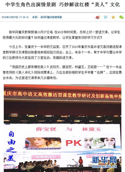 “我国历史上都有哪些美人?武则天、薛宝钗、林黛玉、王昭君……”在十一中金春老师的《美人诗化》现场观摩课上,几位古装扮相的学生手举着“名牌”,出现在舞台中央,为这堂语文课带来几分趣味性。