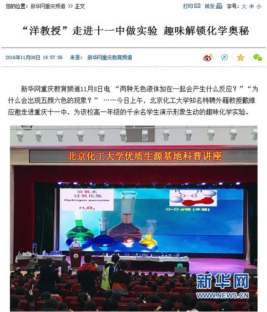 [新华网重庆教育频道]“洋教授”走进十一中做实验 趣味解锁化学奥秘