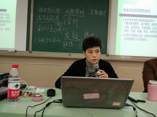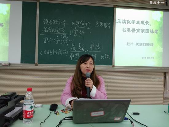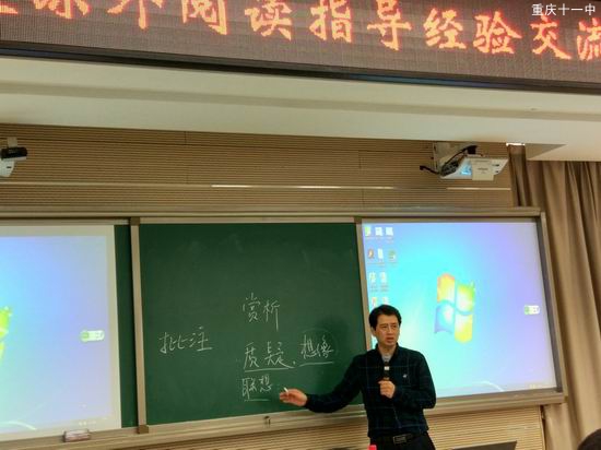 2016年11月15日上午9:00,重庆市第十一中学校修德楼多媒体一室,来自重庆市各个区县的初中语文教师济济一堂,参加“重庆市初中语文课外阅读指导经验交流暨中考质量分析会”,会议由市教研员陈家尧老师主持,会议承办方重庆十一中由初2019级语文备课组的黄莺老师代表与会老师献了一堂名为“走近名著与经典对话”的研讨课。重庆十一中初中语文教研组长雷小利老师、重庆二十九中的特级教师吴莲子老师、长寿区张小平老师、重庆八中唐雨老师、荣昌王老师等教师在会上作了专题发言。