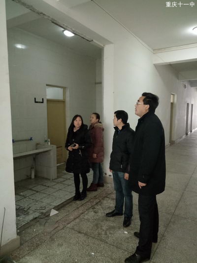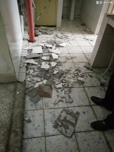 2016年12月13日中午,十一中CBD校区高三午休室,厕所墙面发生瓷砖脱落事件。接到报案后,总务处谢红卫主任率陈志友副主任、甘阳春副主任立即赶赴现场,根据该楼的用途和即将进行的改造等情况,做出如下处理方案:一、将墙面空鼓瓷砖全部剥离,一切以安全为重。二、墙砖脱落部位,先用水泥沙浆紧固并抹平。三、刮腻子、刷白。四、待后期全盘整改。