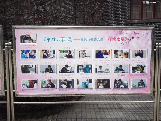 近日,高2019级在全体学生中组织了一次“阅读之星”评比活动。经过自愿报名,班级推荐和年级审核三个环节,每班评选出一名,全年级共计评出了22名“阅读之星”。之后年级为这22名获奖学生颁发了奖状,进行了表彰。这22名获奖同学都是各班在阅读方面的榜样,不仅个人有广泛的阅读,对班级阅读风气的引领也有突出的作用。年级将他们制作成展板,并配以每个人的一句话读书格言向全校展出,在师生中产生了极大的反响。