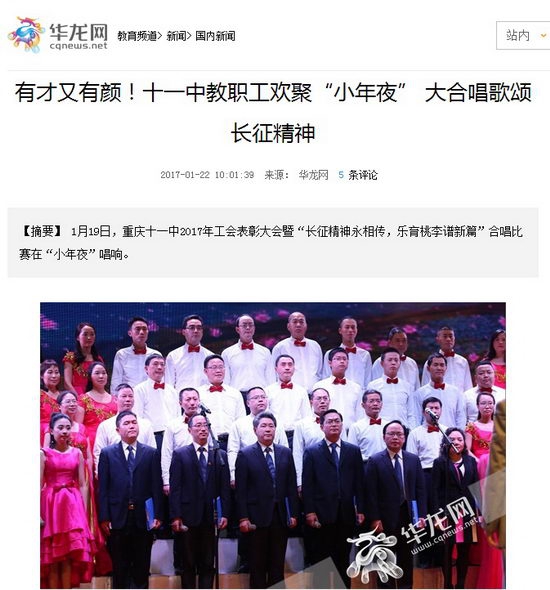 【摘要】 1月19日,重庆十一中2017年工会表彰大会暨“长征精神永相传,乐育桃李谱新篇”合唱比赛在“小年夜”唱响。