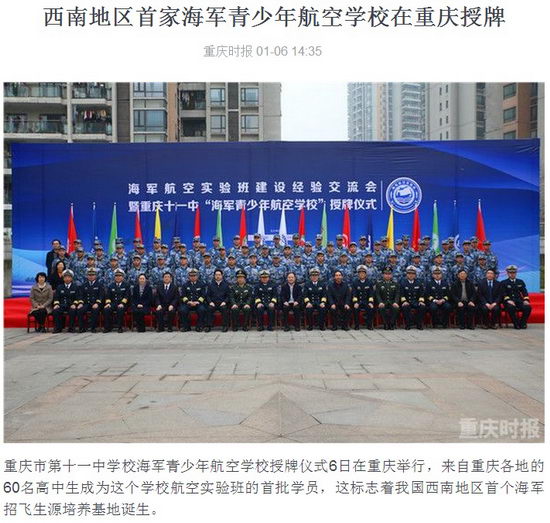 重庆市第十一中学校海军青少年航空学校授牌仪式6日在重庆举行,来自重庆各地的60名高中生成为这个学校航空实验班的首批学员,这标志着我国西南地区首个海军招飞生源培养基地诞生。