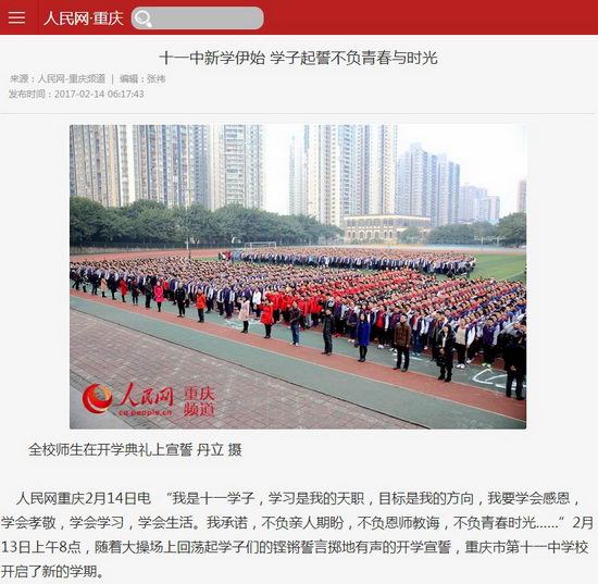 人民网重庆2月14日电 “我是十一学子,学习是我的天职,目标是我的方向,我要学会感恩,学会孝敬,学会学习,学会生活。我承诺,不负亲人期盼,不负恩师教诲,不负青春时光……”2月13日上午8点,随着大操场上回荡起学子们的铿锵誓言掷地有声的开学宣誓,重庆市第十一中学校开启了新的学期。