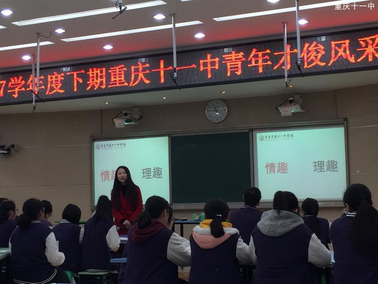 3月14日上午,重庆十一中2016-2017学年度下期青年才俊风采展示高中语文组的比赛在多媒体教室拉开了帷幕。高中五位青年才俊依次登台亮相,送上了精彩纷呈的语文优质课。高2019级语文组全体教师到堂听课学习。
