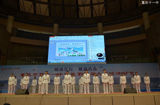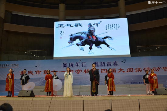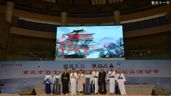 4月25日,重庆十一中高2019级学生在体艺馆举行了“阅读乐行 雅韵青春”诗词唱诵大赛。他们用歌唱、用诵读、用创意,向美好灿烂的诗歌致敬。
