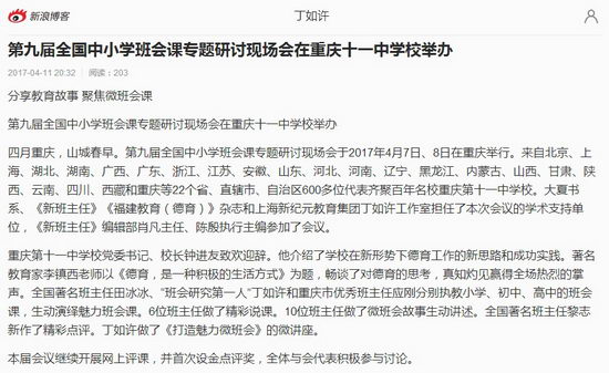 重庆第十一中学校党委书记、校长钟进友致欢迎辞。他介绍了学校在新形势下德育工作的新思路和成功实践。著名教育家李镇西老师以《德育,是一种积极的生活方式》为题,畅谈了对德育的思考,真知灼见赢得全场热烈的掌声。全国著名班主任田冰冰、“班会研究第一人”丁如许和重庆市优秀班主任应刚分别执教小学、初中、高中的班会课,生动演绎魅力班会课。6位班主任做了精彩说课。10位班主任做了微班会故事生动讲述。全国著名班主任黎志新作了精彩点评。丁如许做了《打造魅力微班会》的微讲座。