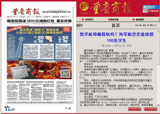 [重庆商报] 想开航母舰载机吗?海军航空实验班招100名学生