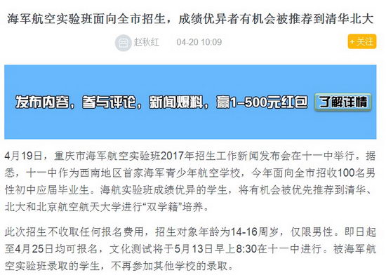 419重庆市海军航空实验班2017年招生工作新闻发布会在十一中举行。据悉,十一中作为西南地区首家海军青少年航空学校,今年面向全市招收100名男性初中应届毕业生。海航实验班成绩优异的学生,将有机会被优先推荐到清华、北大和北京航空航天大学进行“双学籍”培养。