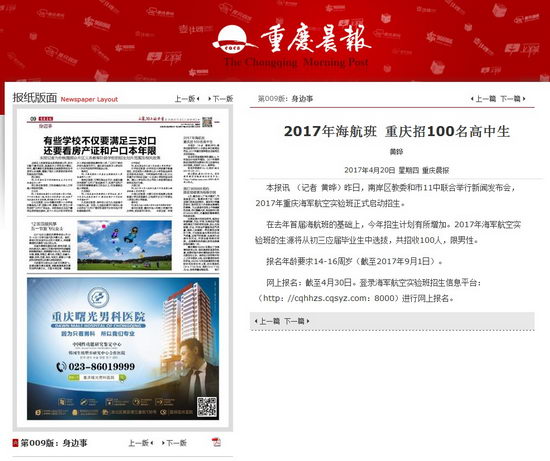 [重庆晨报] 2017年海航班 重庆招100名高中生