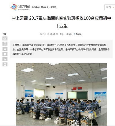 【摘要】 海军航空高中实验班是经海军招收飞行学员工作办公室会同重庆市教委考察并报海军批准,由重庆市第十一中学校承办海军航空高中实验班,由海军招飞办会同学校联合培养,是西部首个海军航空高中实验班。