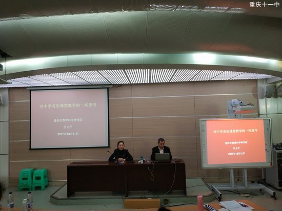 2017年10月31日,重庆市南岸区中学音乐教师第七期全员培训,在重庆市第十一中学校如期举行。此次培训主要由三个板块构成:上午由重庆市教育科学院中学音乐教研员甘元平为老师们讲解《对中学音乐课堂的一些思考》及他对中学音乐教学的感悟。下午由辅仁中学音乐教师詹红(重庆市骨干教师)分享她的成长经历。之后十一中学音乐教师刘方家展示优质课:音乐与舞蹈—《独特的民族风》。最后,老师们就本堂课的四个维度展开学习讨论。