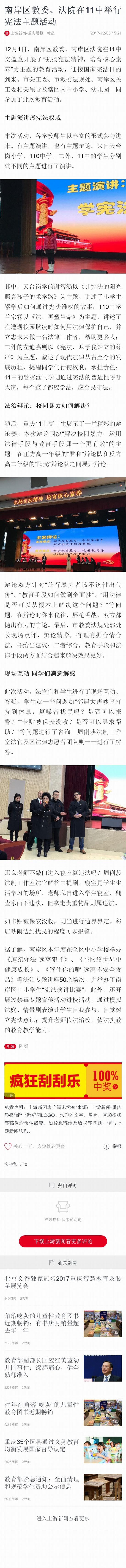 12月1日,南岸区教委、南岸区法院在11中文益堂开展了“弘扬宪法精神,培育核心素养”为主题的教育活动,迎接国家宪法日的到来。市关工委、市教委法规处、南岸区关工委相关领导及辖区内中小学、幼儿园一同参加了此次教育活动。