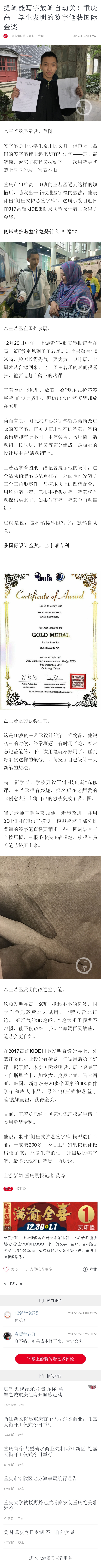 [重庆晨报上游新闻]提笔能写字放笔自动关!重庆高一学生发明的签字笔获国际金奖