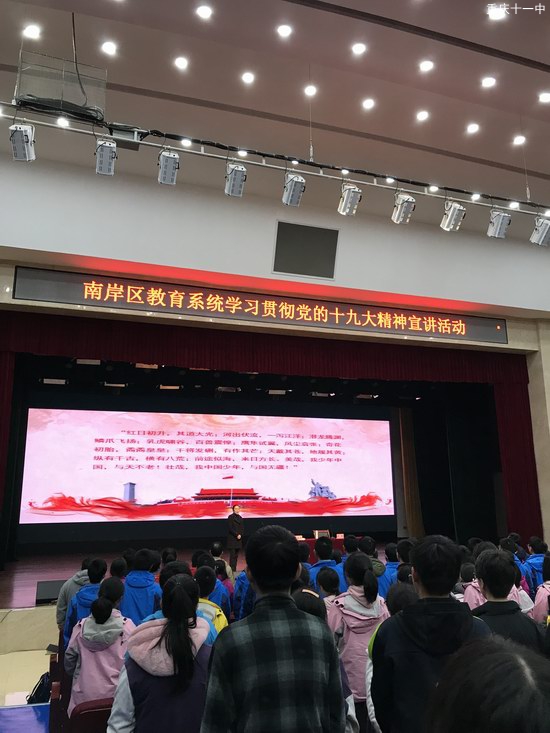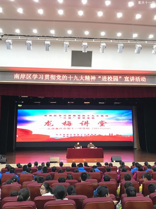 2017年12月14日下午5:00,中共南岸区教育工作委员会书记、南岸区教育委员会主任包茹华书记在重庆市第十一中学校文益堂开展了以“不忘初心跟党走,青春践行十九大”为主题的党的十九大精神“六进”宣讲活动,学校副校长欧宾主持了此次宣讲活动,学校全体行政人员、初三年级全体师生参加并聆听了此次报告。