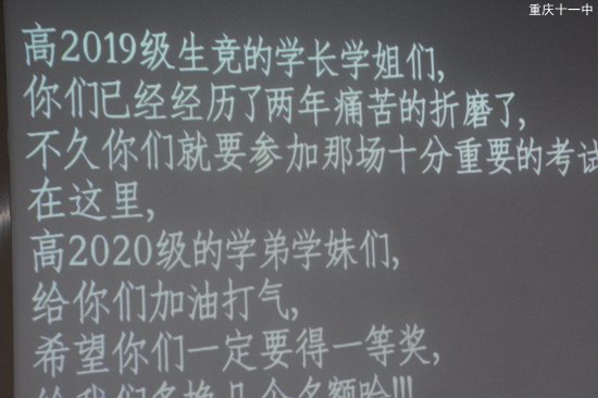 在誓师大会上,高一生物组学弟学妹们,其他高中的生竞学生,远在湖南师大附中进行竞赛培训的生竞战友,还有老师们、家长们都以视频的方式为即将参加联赛的高二生物组同学们送上鼓励和祝福。同学、老师、家长们的支持将永远是生竞学子们的坚强后盾;在漫漫的生竞奋斗路上,19班将永远是生竞学子们的避风港。