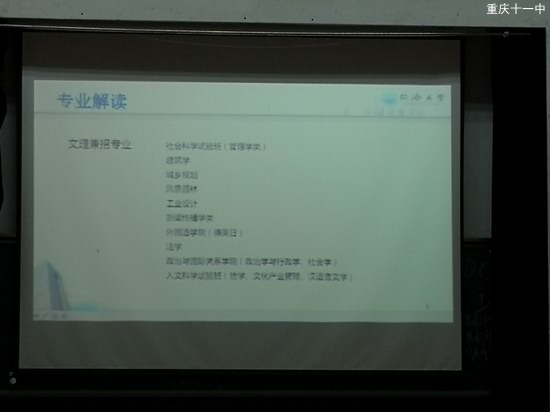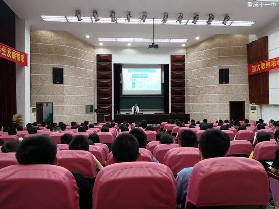 李峥嵘教授首先为我们介绍了同济大学的办学理念:同心同德同舟楫,济人济事济天下,然后为我们图文并茂、深入浅出地讲解了这所综合性大学悠久的历久、求真求实的校风以及在重庆本地的自主招生途径。对于李教授讲述的内容同学们积极提问,包括了跨专业,艺术招生、竞赛招生等典型问题,深切关心自己的未来发展,李教授也对此做出了详细的解答。紧接着,李教授介绍了同济大学各种优秀的特色专业例如土木工程系,建筑系,医学院等。丰富了同学们对大学的认识。最后李教授结合自身专业所长,为我们讲解了身边环境和我们每个人的息息相关之处,比如演唱会现场、游泳馆、滑冰场、乒乓球现场等,以此来引出环境无论多复杂都离不开声、光、电这样三个部分的组成,极大地调动了同学们地兴趣。会场最后为了让我们更好的了解同济这所综合性大学,还为我们发放了同济大学的精致小卡片。