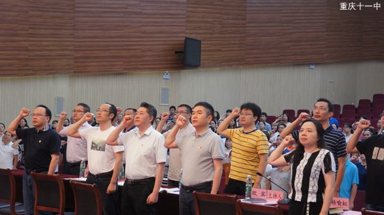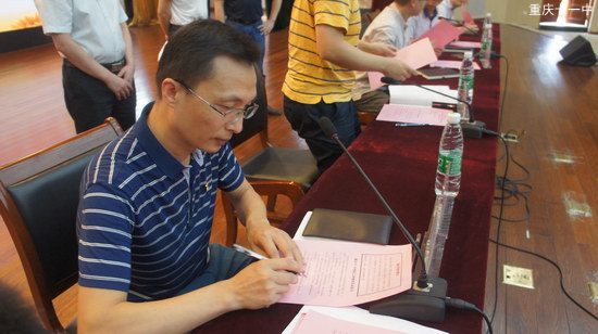 会议伊始,全体教职工庄严地举起右手,再一次重温了重庆市教师誓词。紧接着,各年级组长及行政职工小家家长分别代表各年级、各处室全体教职员工在主席台上签订了《重庆十一中教职工师德师风承诺书》。师德师风承诺书的签订进一步加强了全体教师遵守师德规范、履行为人师表的行为和决心。