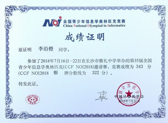 (图为李沿橙获得信息学竞赛全国银牌成绩证明)