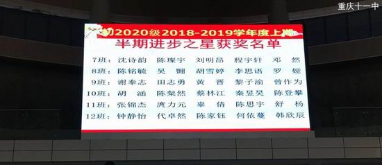 2018年11月2日,下午16时5分,在重庆第十一中学校的体育馆,初2020级的期中表彰大会开始了。本次表彰大会的关键词是“进步”,有进步学生、进步班级、寝室。