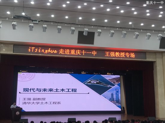 2019年5月11日,由清华大学招生办公室主办、重庆市第十一中学校承办的“走进重庆十一中——王强副教授专场:《现代与未来土木工程》讲座”在十一中文益堂举行。参加本次讲座的有来自清华大学的教授,初三、高一、高二年级卓越班的同学们。讲座由高一4班洪萱仪同学主持。