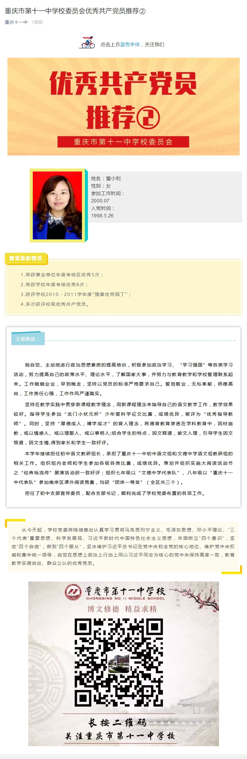 重庆市第十一中学校委员会优秀共产党员推荐②