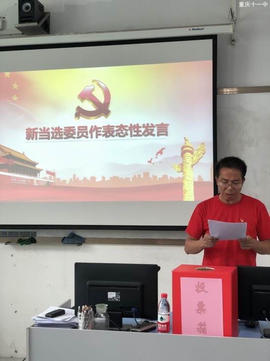2019年8月29日,我校高中第一党支部委员会换届选举会议隆重举行。中共重庆市第十一中学校高中第一党支部委员会共有党员41名,参会并有选举和被选举权党员36名,符合党章规定。
