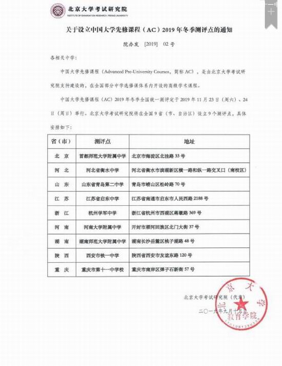 2019年11月23日、24日,成渝两地部分优秀中学生,将在我校参加一项小规模高端学术考试——中国大学先修课程(AC)2019年冬季全国统一测评。届时,来自成都七中、成都外国语学校、绵阳东辰国际学校以及我校的共计154名考生,将参与7个科目的考试。