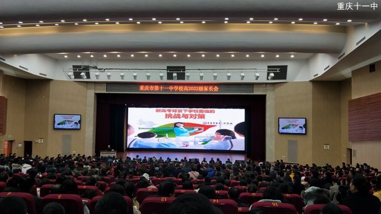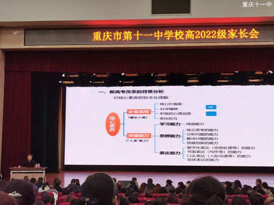 2019年11月30日下午三点在重庆市第十一中学文益堂召开了高2022级家长会。会议由年级主任高波主持,主要分为两个议程:一、钟进友书记结合新时代背景探讨“新高考背景下学校面临的挑战和对策”;二、李顺林副校长结合十一中特色讲解“新高考改革对学校和家庭的挑战和机遇”。