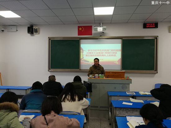 202012日,中共重庆市第十一中学校高中第一支部委员会在博文楼多媒体教室开展20201月主题党日活动。支部党员一起学习了《习近平在庆祝澳门回归祖国20周年大会暨澳门特别行政区第五届政府就职典礼上的讲话》、《习近平在中共中央政治局召开专题民主生活会上的重要讲话精神》,观看了国家主席习近平2020年新年贺词视频。