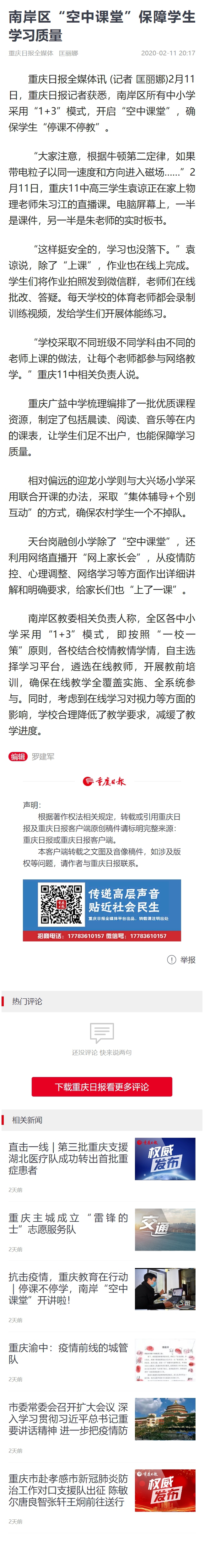 【重庆日报】南岸区“空中课堂”保障学生学习质量