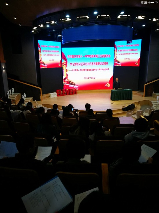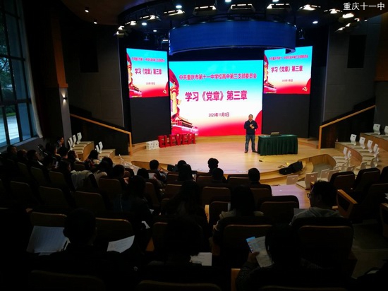 2020年11月5日下午,中共重庆市十一中高中第三支部召开了主题党日活动,会议由支部书记高波主持。会议有两个议程:(一)赵明贤同志组织大家一起学习《中国共产党章程》第二章《党的组织制度》;(二)高波书记带领全体党员学习《习近平出席纪念中国人民志愿军抗美援朝出国作战70周年大会并发表重要讲话》。