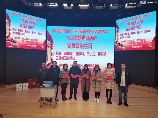为认真学习宣传贯彻党的十九大精神,扎实开展"不忘初心.牢记使命"主题教育活动,充分发挥党员的先锋模范作用,切实增强党组织的战斗堡垒作用。按照学校党委部署,经支委会研究,高中第三党支部决定于2020年12月10日星期四下午在重庆市第十一中学校识益演播厅开展"党员政治生日"活动。