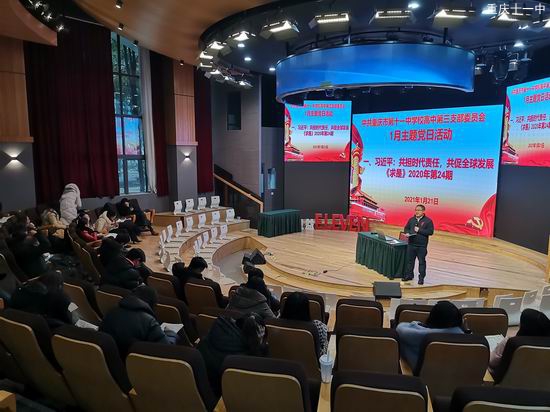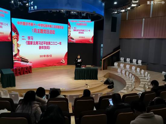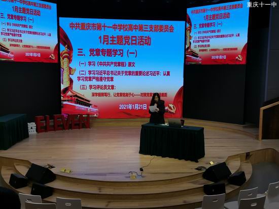 2021年1月21日,重庆市第十一中学校高中第三党支部于识益演播厅开展了2021年1月主题党日活动。本次活动分为三个部分。学习《求是》2020年第24期;学习国家主席习近平二〇二一年新年贺词》;党章专题学习。