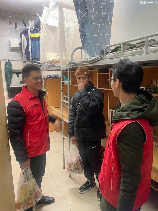 他们一群人大包小包,拎着各种零食学习用具等慰问品到达学生寝室。