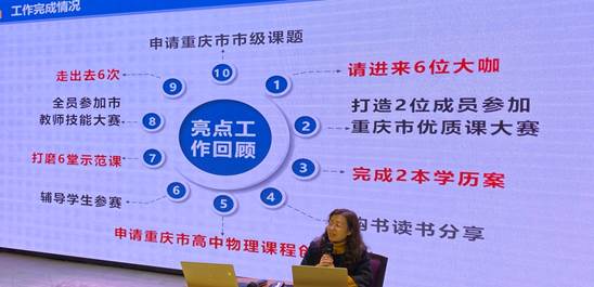 学校对外交流中心副主任、重庆市高中物理课程创新基地主持人、名师工作室主持人、特级教师朱习江主任以“任务驱动共成长,研修引领齐发展”为题,从团队建设情况、工作目标计划、工作完成情况、工作成果展示、工作存在不足和下期工作计划六个方面进行了汇报。朱习江名师工作室以理论修养为起点,专家引领为窗口,课题研究为载体,互帮互学为措施,课堂教学为核心,微课制作为手段,全面推进工作室的建设与发展。工作室成立一年来,取得了丰硕的成果。2020年,物理名师工作室成功申报重庆市高中物理课程创新基地和一项市级重点课题子课题,出版专著、教材3部,主持或主研市区级课题7项,参加市级比赛获奖62项、区级3项,指导学生获市区级奖21项,承担区级以上示范课、优质课展示8节,参加区级以上交流发言6次,受邀作专题学术报告3次,发表论文3篇。
